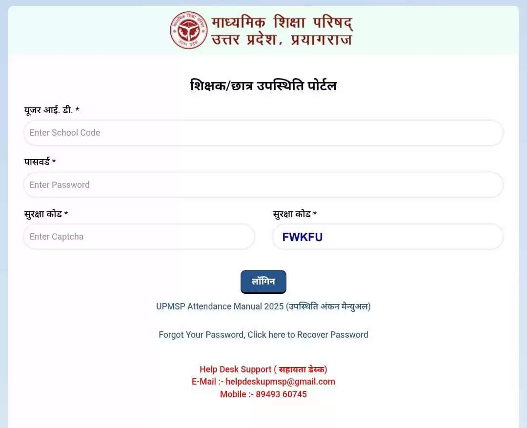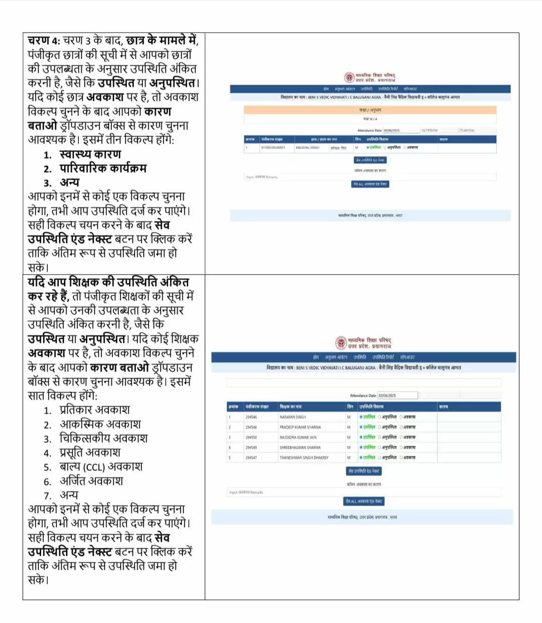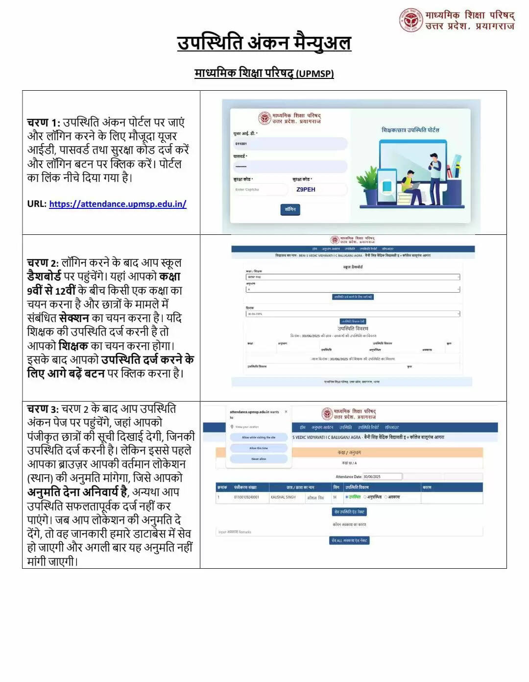 इस उद्देश्य के लिए एक विशेष पोर्टल https://attendance.upmsp.edu.in विकसित किया गया है, साथ ही UPMSP Attendance नामक एक मोबाइल ऐप भी तैयार किया गया है, जो Google Play Store पर उपलब्ध है। सभी विद्यालयों के प्रधानाचार्य को निर्देशित किया गया है कि वे प्रतिदिन प्रथम पीरियड में लॉगिन कर उपस्थिति दर्ज करें। लॉगिन की प्रक्रिया में विद्यालय की पूर्व निर्धारित यूजर आईडी व पासवर्ड का ही उपयोग किया जाएगा।