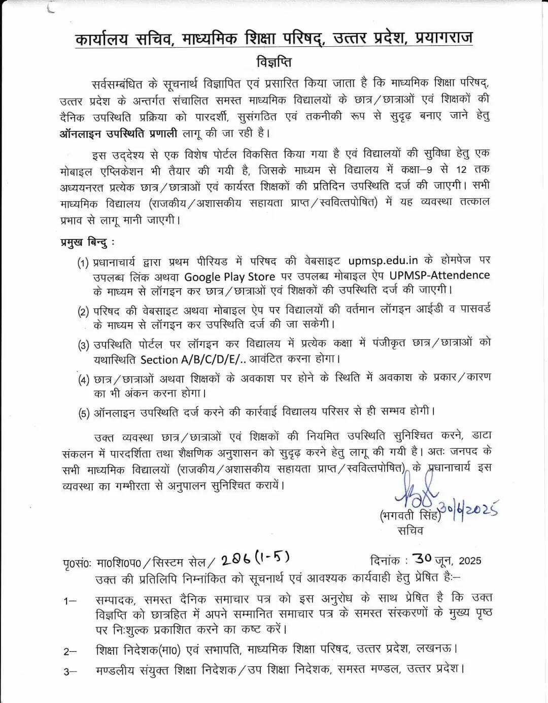 चंदौली जिले के साथ प्रदेश के सभी माध्यमिक विद्यालयों में अब छात्रों और शिक्षकों की उपस्थिति मोबाइल ऐप और पोर्टल के माध्यम से दर्ज की जाएगी। माध्यमिक शिक्षा परिषद उत्तर प्रदेश प्रयागराज द्वारा जारी आदेश में स्पष्ट किया गया है कि कक्षा 9 से 12 तक के छात्र-छात्राओं तथा विद्यालयों में कार्यरत शिक्षकों की दैनिक उपस्थिति को पारदर्शी सुसंगठित एवं तकनीकी रूप से मजबूत बनाने के लिए एक ऑनलाइन उपस्थिति प्रणाली तत्काल प्रभाव से लागू की जा रही है।
