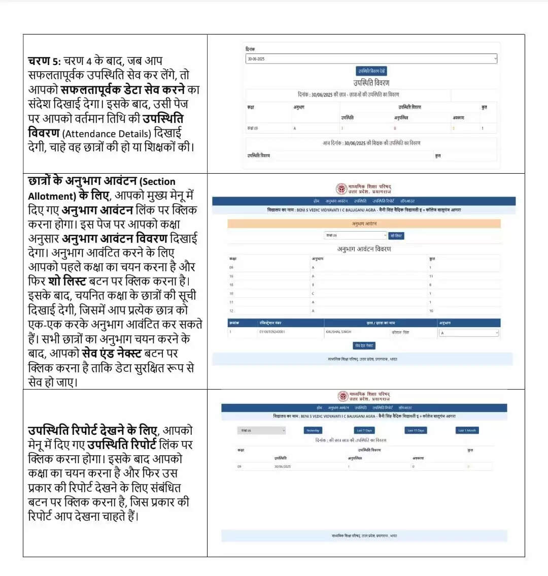 इसके अतिरिक्त विद्यालय को पहले सभी छात्रों का सेक्शन आवंटन Section Allotment करना होगा। इसके लिए मेन्यू में दिए गए सेक्शन लिंक पर जाकर कक्षा अनुसार छात्रों को Section A/B/C में विभाजित करना होगा। उपस्थिति रिपोर्ट भी पोर्टल या ऐप में उपलब्ध Attendance Report लिंक के माध्यम से देखी जा सकती है।