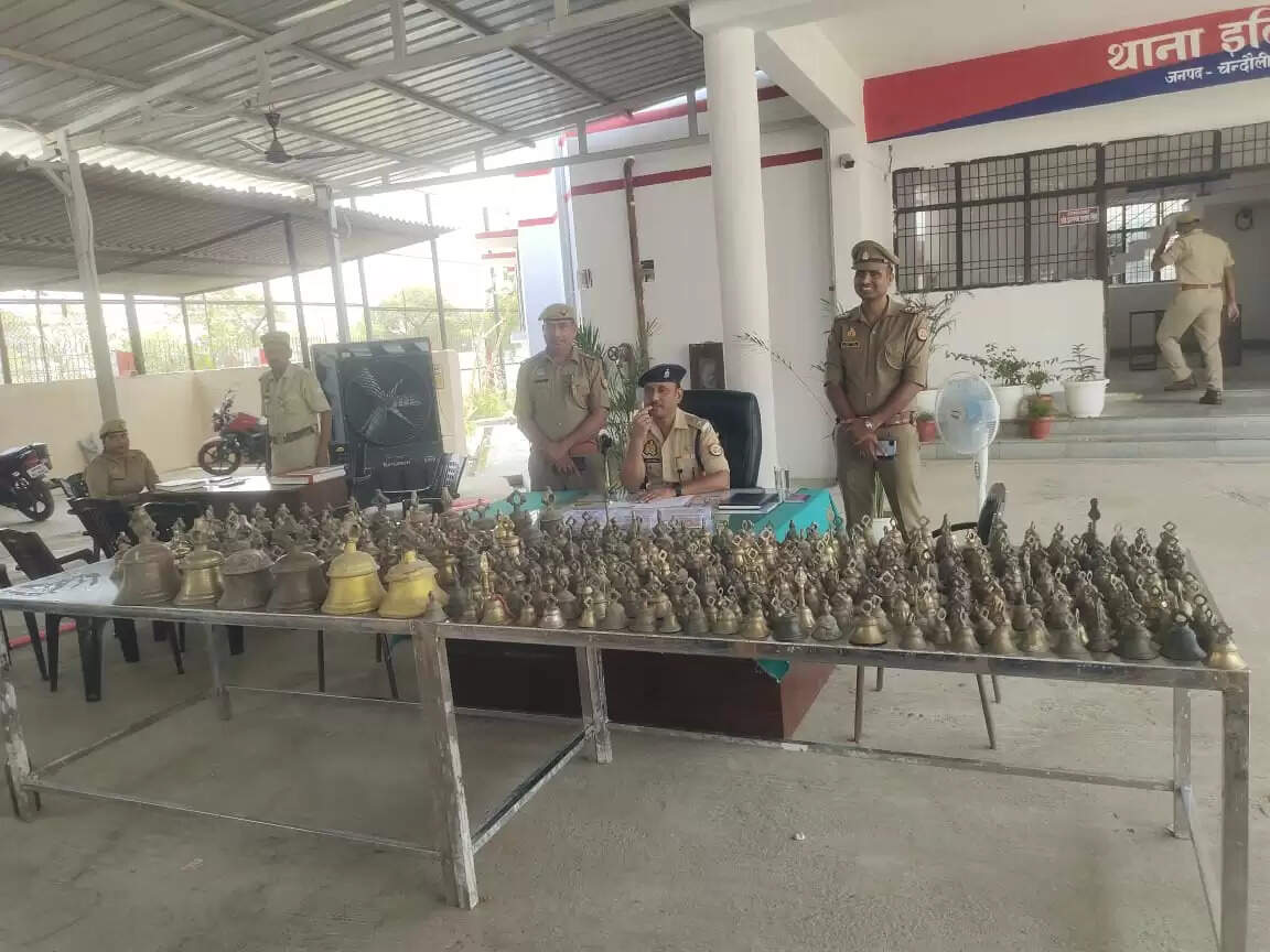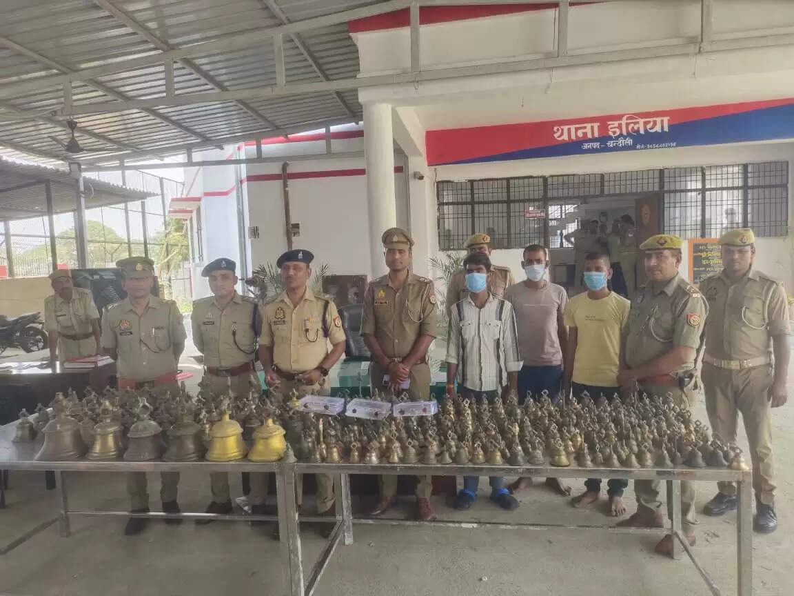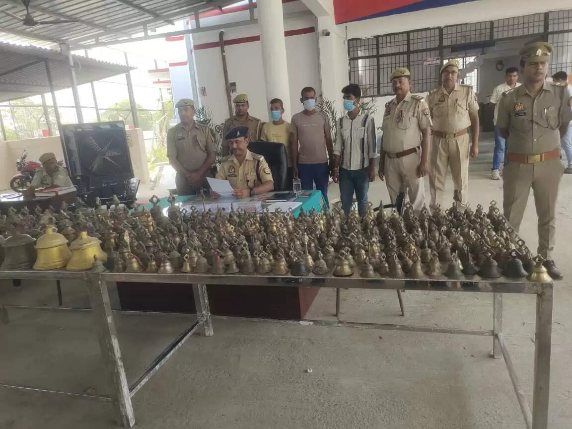 जिसमें मुख्य रूप से मिर्जापुर जनपद के जमालपुर थाना क्षेत्र के चैनपुरवा चौबेपुर के निवासी दो सगे भाई धीरज तिवारी व नीरज तिवारी, तथा अतुल तिवारी को गिरफ्तार किया गया। वही गिरफ्तार अभियुक्तों के निशानदेही पर मिर्जापुर जनपद के जमालपुर थाना के दीपक कुमार उर्फ दीपू को भी गिरफ्तार कर लिया। जिनके पास से छोटी बड़ी कल 394 घंटी, चार चांदी का मुकुट, दो चांदी की मूर्ति की आंख, एक लोहा काटने की आरी व चार लोहा काटने की ब्लेड, चोरी के दौरान इस्तेमाल किए जाने वाली एक स्प्लेंडर मोटरसाइकिल व पंद्रह सौ रुपए नगदी बरामद किया गया है।