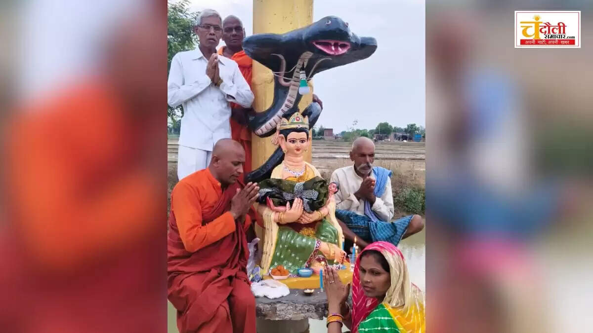 शेषनाग की छत्रछाया में महामाया माता की प्रतिमा के समक्ष भिक्षुओं ने की पूजा