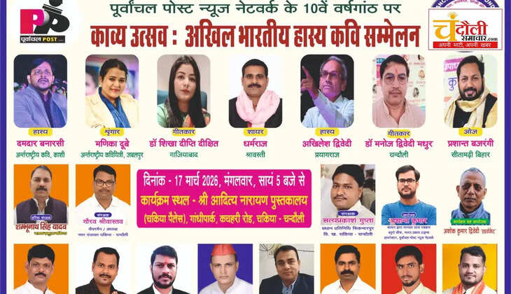 चंदौली जनपद के चकिया नगर में साहित्य और संस्कृति का अनूठा संगम देखने को मिलेगा। पूर्वांचल पोस्ट फाउंडेशन उत्तर प्रदेश द्वारा संचालित 'पूर्वांचल पोस्ट न्यूज नेटवर्क' के शानदार दस वर्ष पूरे होने के उपलक्ष्य में आगामी मंगलवार, 17 मार्च 2026 की शाम को एक भव्य अखिल भारतीय हास्य कवि सम्मेलन का आयोजन किया जा रहा है। नगर के ऐतिहासिक आदित्य पुस्तकालय परिसर में होने वाले इस कार्यक्रम में देश और प्रदेश के नामचीन अंतरराष्ट्रीय कवियों का जमावड़ा लगेगा।