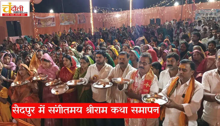 चंदौली जिले के चकिया तहसील अंतर्गत सैदपुर कस्बा स्थित राइस मिल प्रांगण में श्री राम सेवा समिति द्वारा आयोजित नौ दिवसीय संगीतमय श्रीराम कथा का रविवार को श्रद्धा और उल्लास के साथ समापन हो गया। कथा के अंतिम दिन भगवान श्रीराम के राजतिलक के दृश्य ने पूरे पंडाल को अयोध्या के उत्सव जैसा स्वरूप प्रदान कर दिया।