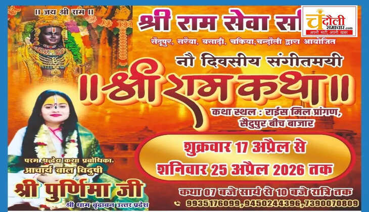 चंदौली जनपद के चकिया तहसील अंतर्गत सैदूपुर क्षेत्र में भक्ति और आध्यात्म की बयार बहने वाली है। आगामी 17 अप्रैल से 25 अप्रैल तक सैदूपुर बीच बाजार स्थित राइस मिल प्रांगण में 'श्री राम सेवा समिति' द्वारा भव्य नव दिवसीय श्रीराम कथा का आयोजन सुनिश्चित किया गया है। इस धार्मिक अनुष्ठान को लेकर स्थानीय लोगों और श्रद्धालुओं में जबरदस्त उत्साह देखा जा रहा है।