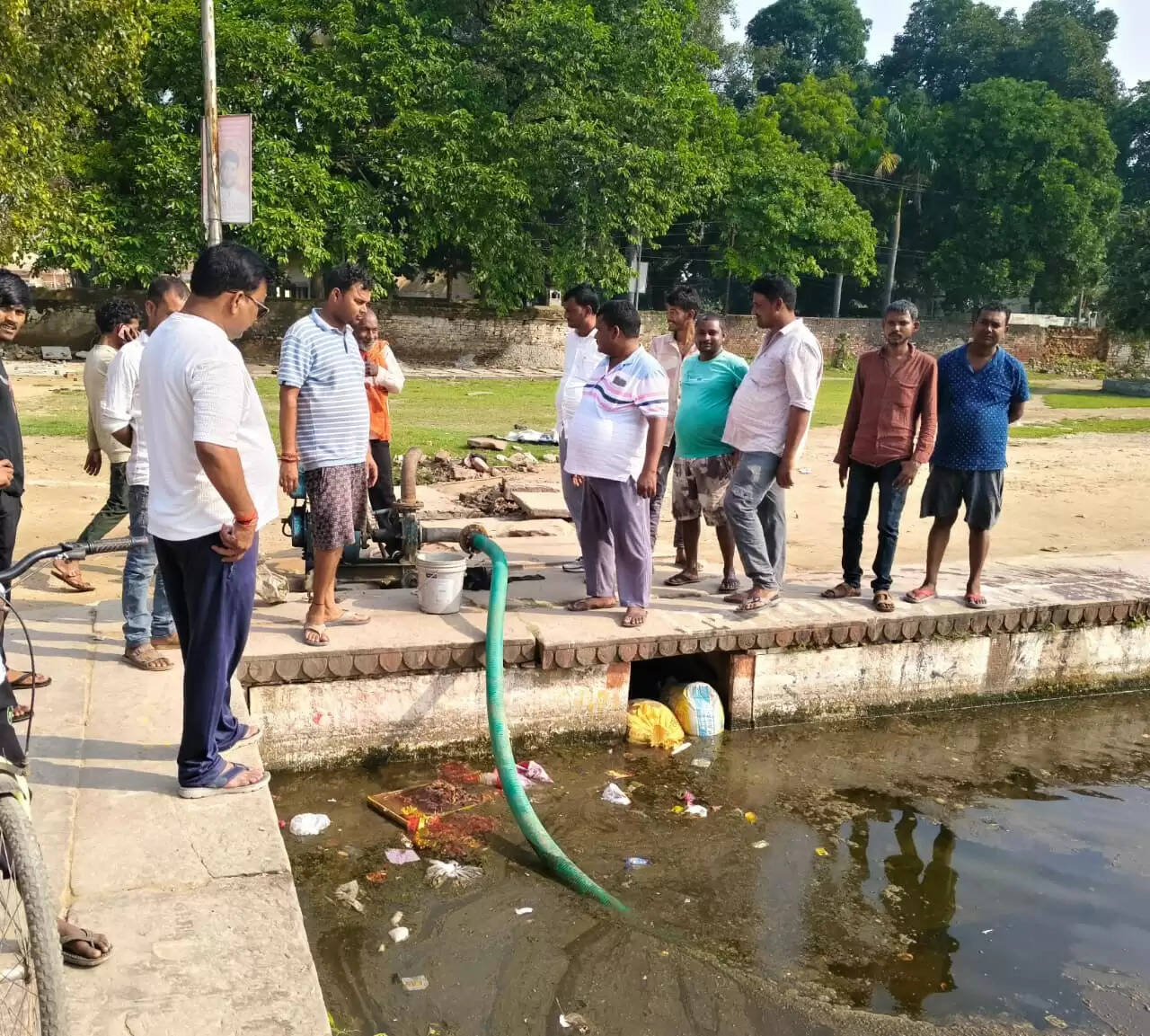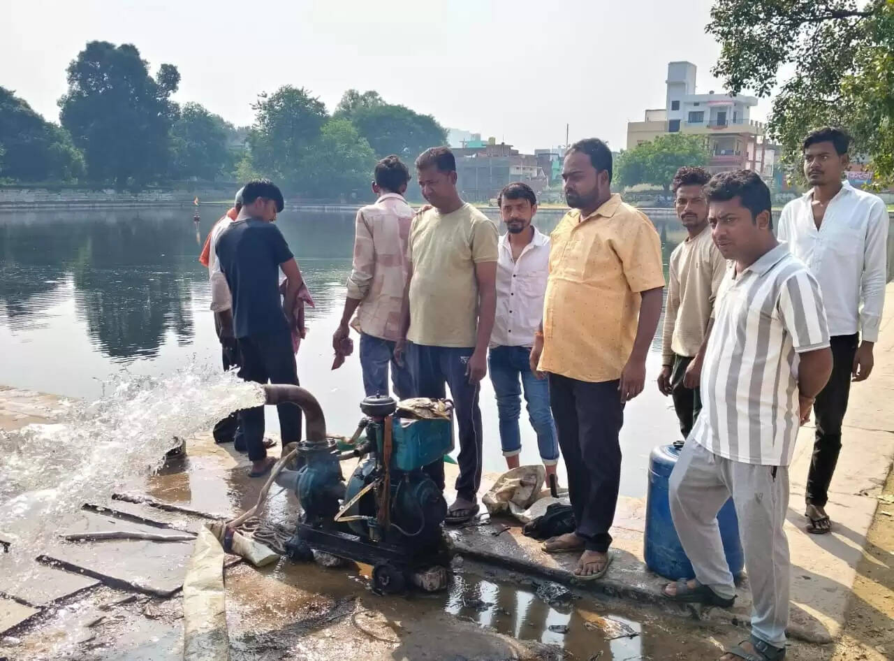 समिति अध्यक्ष गुरुदेव चौहान ने बताया कि लगातार हो रही बारिश के कारण तालाब की सीढ़ियां पूरी तरह पानी में डूब गई थीं। इस वजह से व्रती महिलाओं के लिए पूजा स्थल पर खड़ा होना कठिन हो रहा था। उन्होंने कहा कि महिलाओं को सुविधा प्रदान करने और छठ महापर्व की भव्यता बनाए रखने के लिए तालाब की सीढ़ियों से अनावश्यक पानी निकालकर उन्हें साफ किया जा रहा है।
