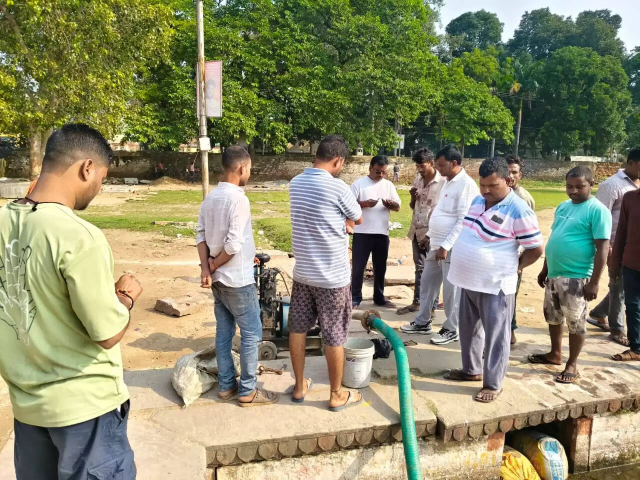 डाला छठ पूजा की तैयारी में जुटे समिति सदस्य, तालाब से निकाला अनावश्यक पानी