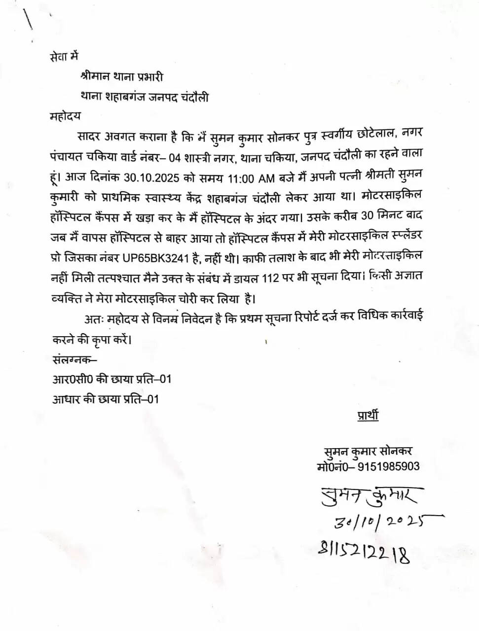 मिली जानकारी के अनुसार, चकिया निवासी सुमन कुमार अपनी पत्नी सुमन सोनकर के साथ शहाबगंज प्राथमिक स्वास्थ्य केंद्र पहुंचे थे। सुमन सोनकर एक एनएम (महिला स्वास्थ्य कार्यकर्ता) हैं और वे साप्ताहिक बैठक में शामिल होने के लिए अस्पताल आई थीं। सुमन कुमार ने अपनी स्प्लेंडर प्रो मोटरसाइकिल (UP 65 BK 3241) को अस्पताल परिसर में खड़ा कर दिया था।