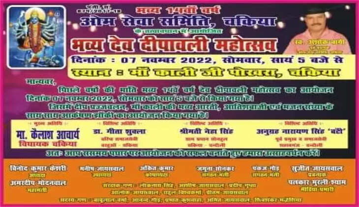 चंदौली जिला के चकिया में देव दीपावली महोत्सव का भब्य आयोजन मां काली मंदिर परिसर में 7 नवंबर सोमवार को शाम 5 बजे से किया गया है। इसके लिए सारी तैयारियां पूर्ण कर ली गयी हैं।
