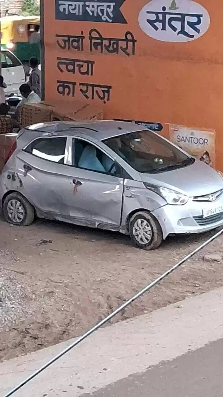 भीगी सड़क पर फिसलन के चलते पलटी रेलवे कर्मचारी की गाड़ी