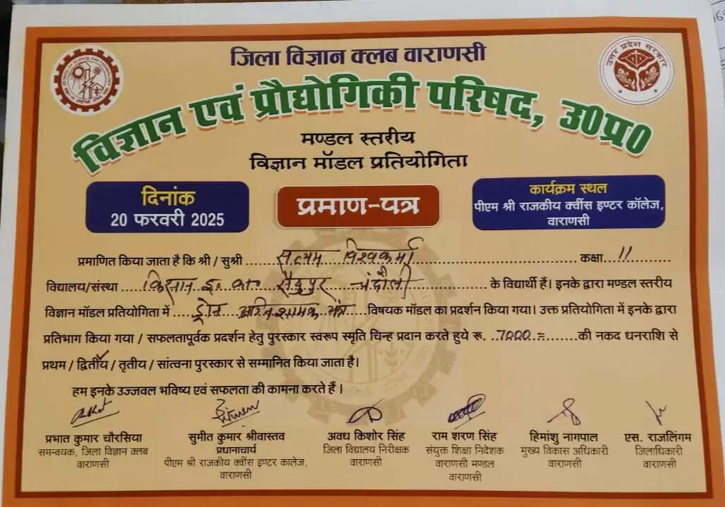 वाराणसी के क्वींस कॉलेज में मंडल स्तरीय विज्ञान मॉडल प्रतियोगिता में मॉडल ड्रोन अग्निशामक यंत्र की प्रस्तुति करने वाला सत्यम विश्वकर्मा ने मंडल स्तर पर द्वितीय स्थान प्राप्त किया। जिस पर उसे सात हजार का नगद पुरस्कार के साथ प्रदेश स्तरीय प्रतियोगिता के लिए चयन किया गया। प्रतियोगिता क्वालिफाइड कर वापस लौटने के बाद विद्यालय में सम्मान समारोह का आयोजन किया गया। जिसमें छात्र सत्यम विश्वकर्मा को प्रधानाचार्य राजेश कुमार तथा विज्ञान विषय के शिक्षक गिरीश कुमार शर्मा ने उसे प्रशस्ति पत्र प्रदान किया।