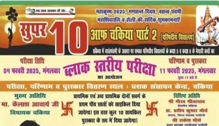 चंदौली जिला के चकिया नगर पंचायत स्थित ब्लाक संसाधन केंद्र परिसर में बसंत पंचमी के अवसर पर आगामी 4 फरवरी को परिषदीय विद्यालयों के कक्षा 5 से लेकर आठ तक के मेधावी छात्रों का ब्लॉक स्तरीय सुपर 10 आफ चकिया पार्ट 2 परीक्षा का आयोजन किया जाएगा। परीक्षा परिणाम घोषित होने के बाद आगामी 11 फरवरी को ब्लॉक संसाधन केंद्र परिसर में पुरस्कार वितरण कार्यक्रम आयोजित होगा। परीक्षा में अच्छे अंक लाने वाले मेधावी विद्यार्थियों को अतिथियों द्वारा पुरस्कृत कर उनका हौसला बढ़ाया जाएगा।