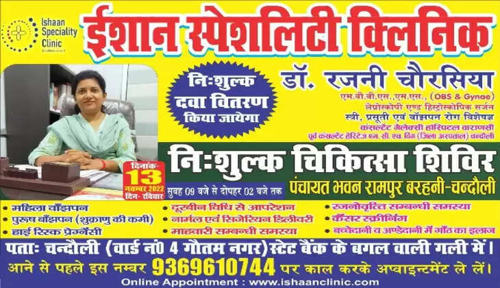 डॉ रजनी चौरसिया ने कहा कि ईशान स्पेशलिटी क्लीनिक चंदौली जनपद के वार्ड नंबर 4 में, स्टेट बैंक के पास वाली गली में चलती है। वह क्लीनिक पर निर्धारित समयों पर उपस्थित रहती हैं, जहां पर कोई भी मरीज से चिकित्सा सुविधा व स्वास्थ्य परीक्षण के लिए आ सकता है। उन्होंने इसके लिए अपना नंबर भी शेयर किया है, ताकि कोई भी मरीज पर फोन करके अपॉइंटमेंट ले सकता है और निर्धारित समय पर आकर अपनी चिकित्सा करवा सकता है। कहा कि 9369 610 744 पर आप अपॉइंटमेंट ले सकते हैं और तय समय पर अस्पताल में आ सकते हैं।