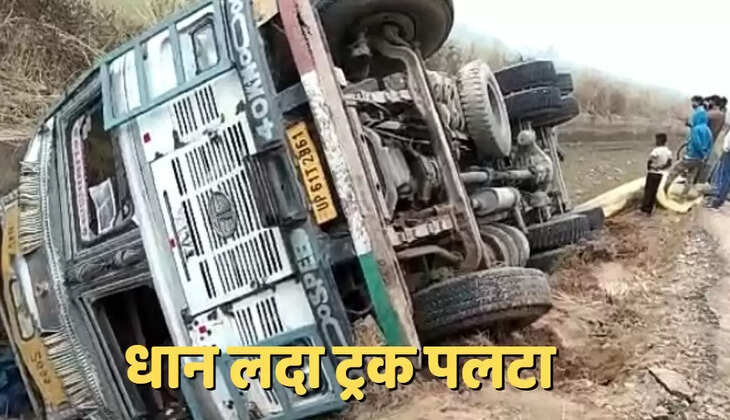 धान की बोरियों से लदा ट्रक पलटा, बाल-बाल बचे ड्राइवर व खलासी