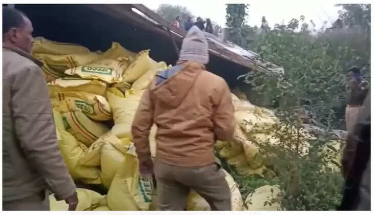 डीएपी खाद से भरी ट्रक पलटी, सुरक्षा में कंदवा पुलिस बल तैनात