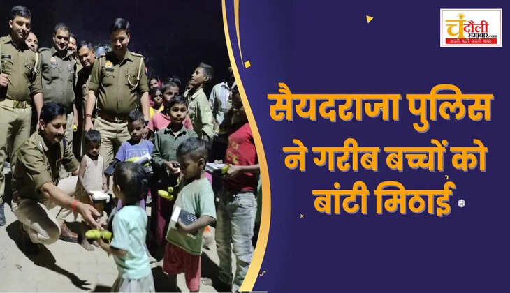बता दें कि पुलिस अधीक्षक डॉक्टर अनिल कुमार के निर्देशानुसार सैयदराजा थाना क्षेत्र के मलिन बस्तियों में रहने वाले गरीब लोगों व बच्चों के साथ पुलिसकर्मियों ने दीपावली के पूर्व संध्या पर खुशियां साझा की। क्षेत्राधिकारी सदर रामवीर सिंह तथा सैयदराजा थाना प्रभारी संतोष सिंह व सैयद राजा पुलिस द्वारा क्षेत्र में भ्रमण कर मलिन बस्तियों में जाकर गरीब बच्चों एवं उनके परिवार के बीच मिठाई वितरित कर दीपावली की शुभकामना दी गयी।