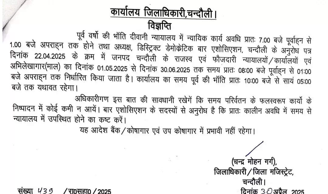 जिले के जिलाधिकारी चंद्र मोहन गर्ग ने आदेश जारी करते हुए कहा है कि पहले की भांति इस बार भी 1 मई से सभी दीवानी न्यायालयों की तरह राजस्व और फौजदारी न्यायालयों के कार्यालय भी प्रातः कालीन हो जाएंगे। जिलाधिकारी में 30 अप्रैल को आदेश जारी करते हुए कहा कि दिवानी न्यायालय में न्यायिक कार्यों की अवधि प्रातः 7:00 बजे से दोपहर 1:00 बजे तक हो गई है। इसके बाद जिले के जिला बार एसोसिएशन के अनुरोध पर जनपद के सभी राजस्व और फौजदारी न्यायालय और कार्यालयों के साथ-साथ अभिलेखागार को अब प्रातः 8:00 बजे से दोपहर 1:00 बजे तक चलाया जाएगा, जबकि समस्त कार्यालयों का समय पूर्व की भारतीय सुबह 10:00 बजे से लेकर सायंकाल 5:00 बजे तक रहेगा।