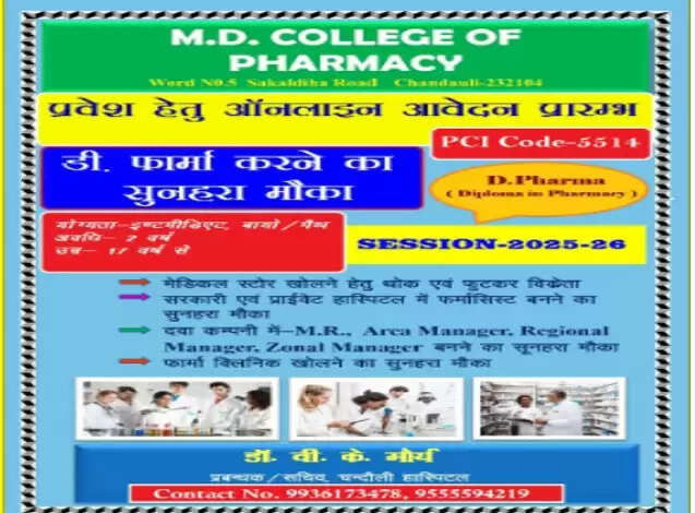 चंदौली जिले के जिला मुख्यालय पर स्थित एमडी कॉलेज ऑफ फार्मेसी में शैक्षणिक सत्र के लिए डी.फार्मा (डिप्लोमा इन फार्मेसी) में प्रवेश प्रक्रिया प्रारंभ हो गई है। यह उन छात्रों के लिए सुनहरा अवसर है, जो चिकित्सा और फार्मेसी क्षेत्र में अपना भविष्य बनाना चाहते हैं। कॉलेज ने घोषणा की है कि इस पाठ्यक्रम में प्रवेश के लिए सीटें सीमित हैं, इसलिए इच्छुक छात्र शीघ्र आवेदन कर लाभ उठा सकते हैं। इसमें प्रवेश की अंतिम तिथि 10 में 2025 निर्धारित है। इसके साथ ही साथ इस कोर्स में आवेदन करने वाले छात्रों का आवेदन व प्रवेश निशुल्क किया जाएगा।