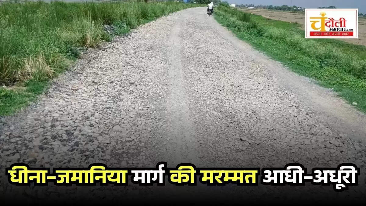चंदौली जिले के धीना-जमानिया मार्ग की मरम्मत आधी-अधूरी हालत में छोड़ दिए जाने से राहगीरों के लिए यह सड़क जानलेवा साबित हो रही है। लगभग चौदह किलोमीटर लंबे इस मार्ग में ठेकेदार द्वारा ढाई किलोमीटर हिस्से की पुरानी पिच को तोड़कर उस पर केवल बड़ी-बड़ी गिट्टियां डाल दी गई हैं। महीनों से यह गिट्टी यूं ही पड़ी है, जिससे आने-जाने वाले लोग गिरकर घायल हो रहे हैं।