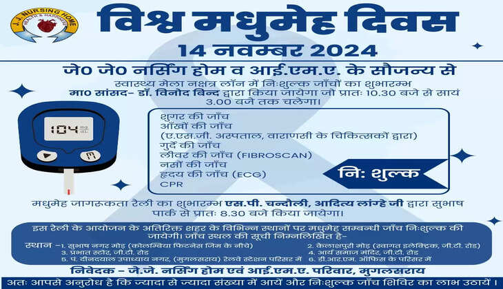 चंदौली जिले के जे जे नर्सिंग होम व आई एम में के सौजन्य से विश्व मधुमेह दिवस के अवसर पर निशुल्क शिविर का आयोजन किया जा रहा है ।