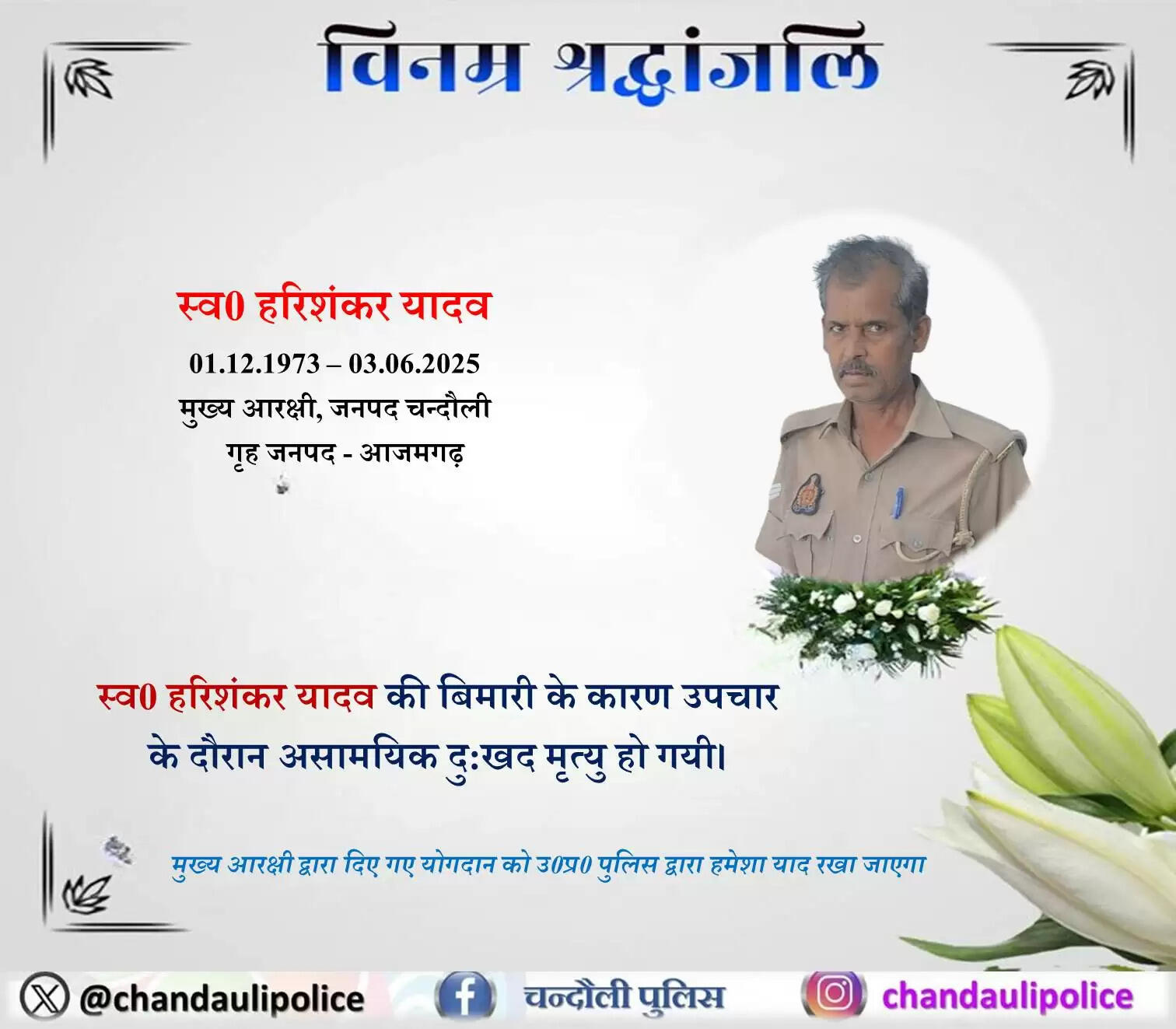 बताते चलें कि हरिशंकर यादव 01 दिसंबर 1973 को गृह जनपद आजमगढ़ जन्मे थे और 3 जून 2025 को उन्होंने अंतिम सांस ली। अपने सेवाकाल के दौरान उन्होंने उत्तर प्रदेश पुलिस विभाग में ईमानदारी, कर्तव्यपरायणता और निष्ठा के साथ कार्य किया। उनकी मृत्यु से न केवल पुलिस विभाग बल्कि साथी कर्मचारियों और जनपद चंदौली में एक गहरी शोक की लहर दौड़ गई है। पुलिस विभाग ने उनके योगदान को याद करते हुए उन्हें विनम्र श्रद्धांजलि अर्पित की है।