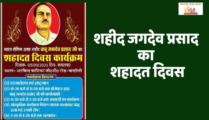 चंदौली जिले में भारत लेनिन अमर शहीद बाबू जगदेव प्रसाद जी का शहादत दिवस कार्यक्रम चंदौली में एक निजी लान में मानने की तैयारी शुरू कर दी गई है। इसके लिए आयोजकों के द्वारा दिनांक 05 सितंबर का दिन तय किया गया है। मंगलवार के दिन जीटी रोड के किनारे स्थित अरविन्द वाटिका लॉन में आयोजन किया जाएगा।