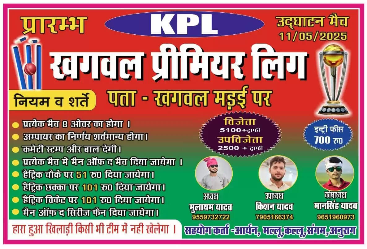 चंदौली जिले में आज 11 मई दिन रविवार को खगवल मड़ई पर खगवल प्रीमियर लीग (केपीएल) क्रिकेट का उद्घाटन किया गया। खगवल प्रीमियर लीग क्रिकेट का उद्घाटन अध्यक्ष मुलायम यादव के द्वारा रिबन काट कर किया गया।