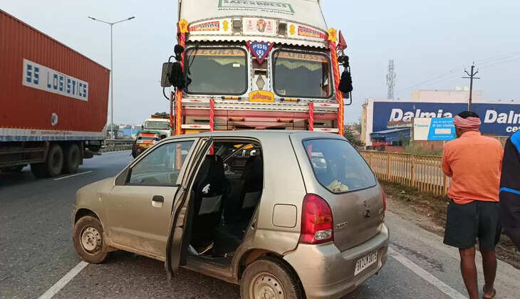 NH-19 पर बड़ा हादसा टला: कंटेनर की टक्कर के बावजूद कार सवार सुरक्षित
