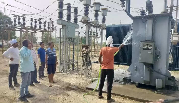 बिजली आपूर्ति बहाल रखने को कर्मचारी कर रहे पानी का छिड़काव