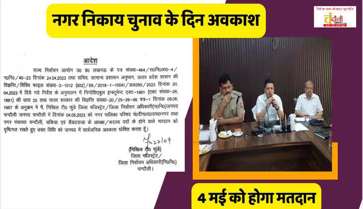 बता दें कि चंदौली जिले के जिलाधिकारी द्वारा राज्य निर्वाचन आयोग उत्तर प्रदेश के निर्देश के क्रम में सचिव सामान्य शासन अनुभाग उत्तर प्रदेश के दिए गए निर्देश के अनुपालन में निगोशिएबुल इंस्ट्रूमेंट एक्ट 1881 की धारा 25 तथा भारत सरकार के विज्ञप्ति के अनुपालन में जिला निर्वाचन अधिकारी चंदौली द्वारा 4 मई 2023 को जनपद में नगर पालिका परिषद पंडित दीनदयाल उपाध्याय नगर तथा नगर पंचायत चंदौली चकिया एवं सैयदराजा के अध्यक्ष तथा सदस्यों के पदों के लिए होने वाले मतदान को दृष्टिगत रखते हुए उक्त 4 मई 2023 को सार्वजनिक अवकाश घोषित किया गया है, ताकि जिले में शांतिपूर्वक मतदान संपन्न हो सके और सभी लोग अपने मताधिकार का उपयोग कर सकें।