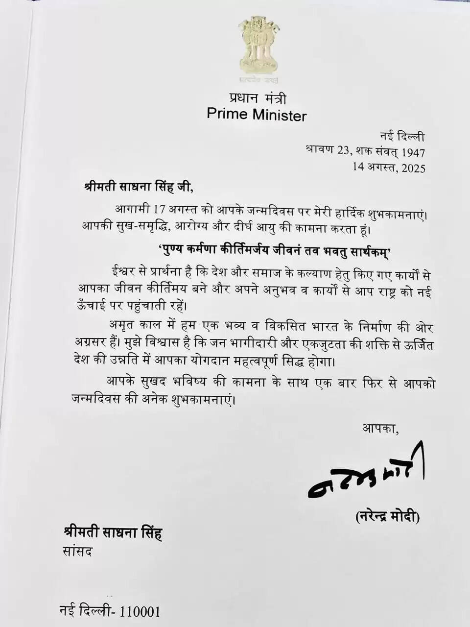 प्रधानमंत्री मोदी का पत्र बना राज्यसभा सांसद साधना सिंह के जन्मदिन की सबसे बड़ी सौगात"