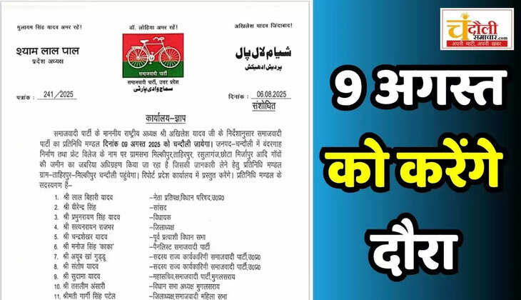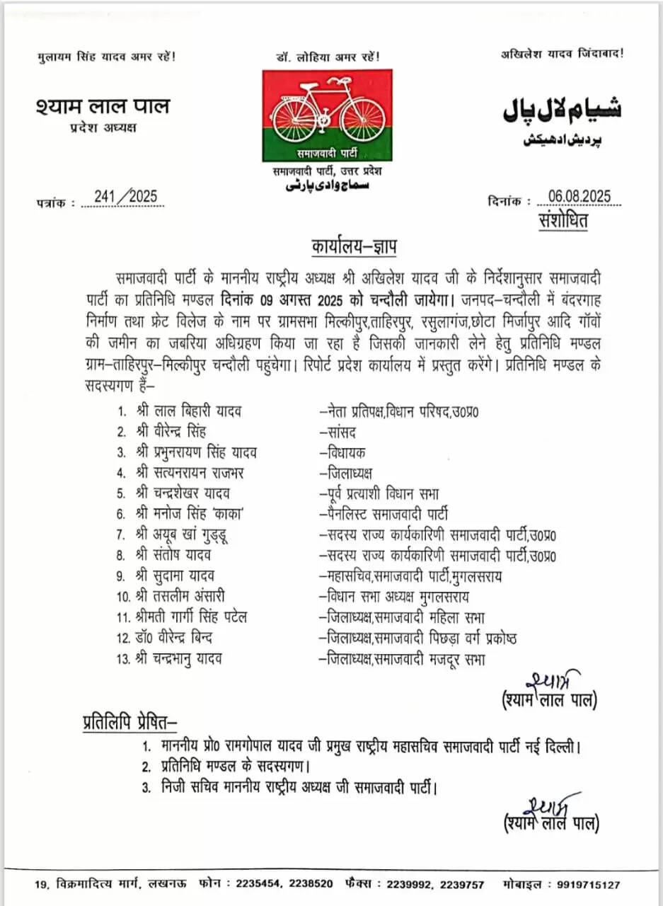 चंदौली जिले में समाजवादी पार्टी के राष्ट्रीय अध्यक्ष अखिलेश यादव के निर्देश पर 9 अगस्त 2025 को समाजवादी पार्टी का एक उच्चस्तरीय प्रतिनिधिमंडल चंदौली जनपद का दौरा करेगा। यह दौरा बंदरगाह निर्माण तथा फ्रेट विलेज निर्माण कार्य के नाम पर ग्रामसभा मिल्कीपुर, ताहिरपुर, सुसुवाही, छोटा मिर्जापुर आदि गांवों की भूमि के जबरन अधिग्रहण को लेकर किया जा रहा है।