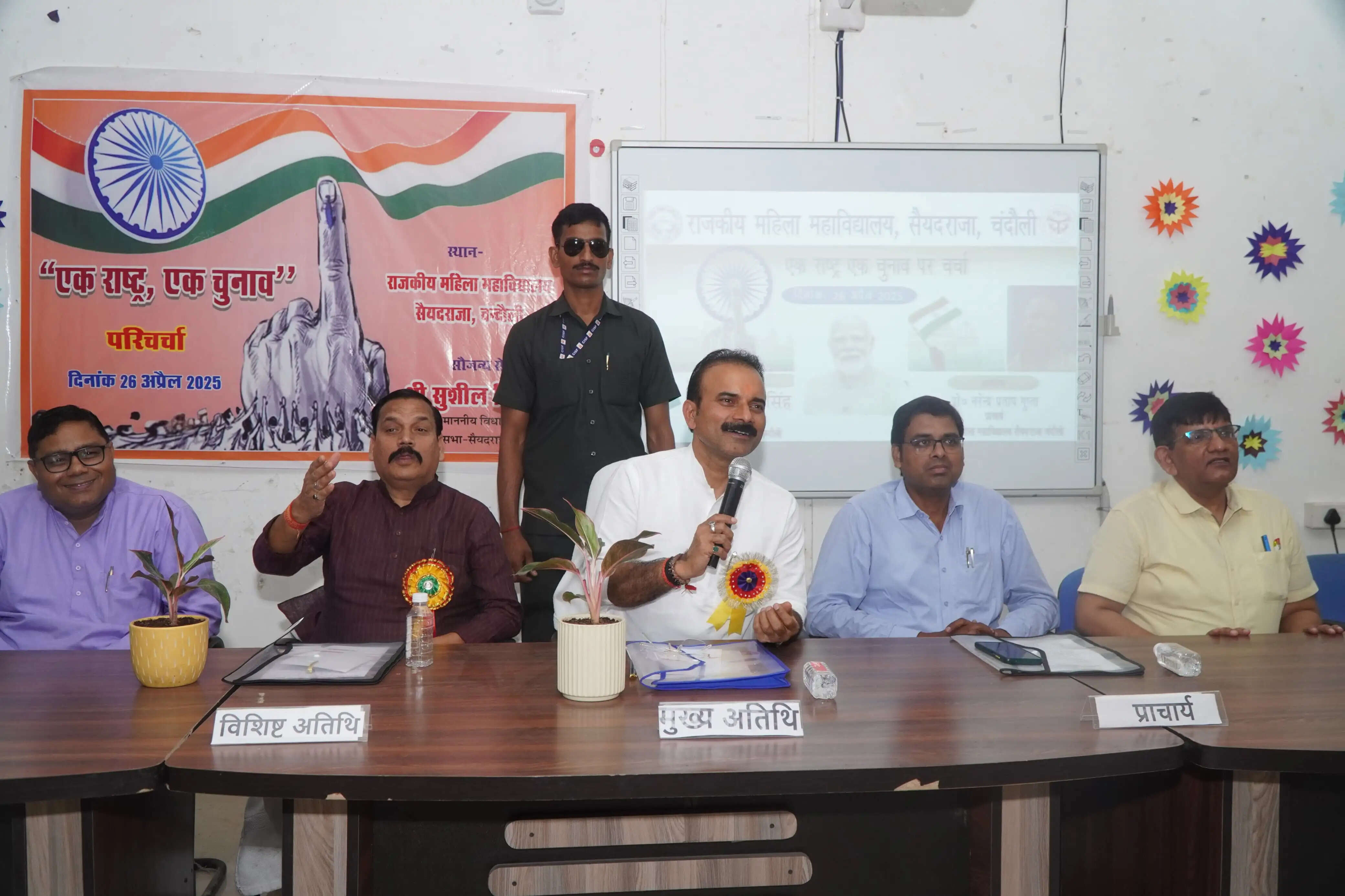 चंदौली जिले में एक देश एक चुनाव को लेकर सैयदराजा विधानसभा के राजकीय महिला पी.जी.कॉलेज सैयदराजा में शनिवार को एक संगोष्ठी आयोजित की गई, जिसमें सैयदराजा विधायक सुशील सिंह समेत कई लोगों ने शिरकत की और अपने अपने विचार रखे। कार्यक्रम में संपूर्ण देश में एक साथ एक चुनाव करने के फायदे के बारे में लोगों ने बताया गया।