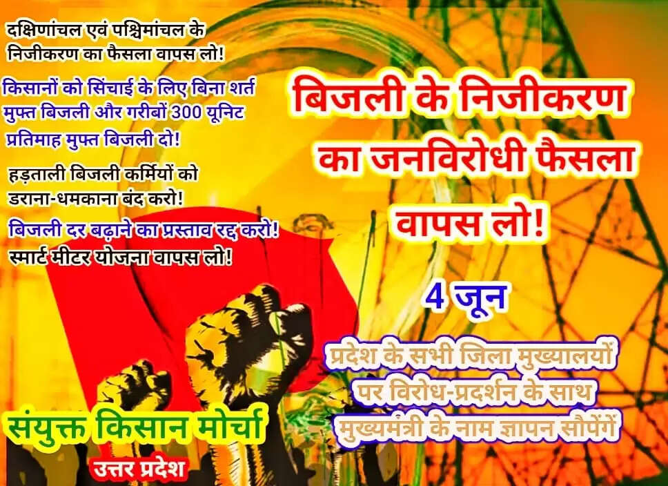 बिजली के निजीकरण के विरोध में बड़ा आंदोलन करेगा किसान मोर्चा, 4 जून को जिला मुख्यालयों पर होगा प्रदर्शन