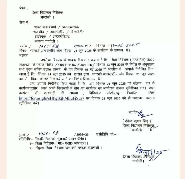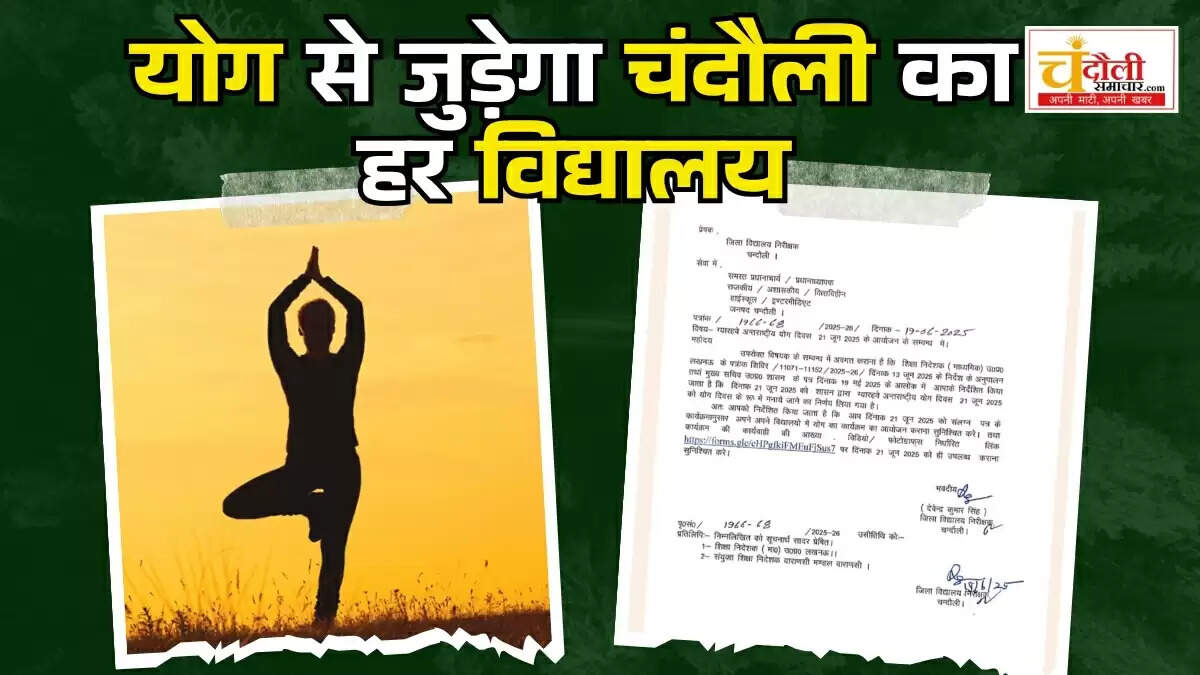 चंदौली जिले में अंतरराष्ट्रीय योग दिवस के अवसर पर चंदौली जिले के सभी माध्यमिक विद्यालयों में 21 जून को विशेष योग कार्यक्रम का आयोजन किया जाएगा। इसके लिए जिला विद्यालय निरीक्षक देवेंद्र कुमार सिंह ने सभी राजकीय, अशासकीय सहायता प्राप्त एवं वित्तविहीन हाईस्कूल और इंटरमीडिएट विद्यालयों को स्पष्ट निर्देश जारी कर दिए हैं।