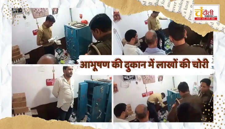 चंदौली जनपद के सकलडीहा कोतवाली क्षेत्र के चतुर्भुजपुर बाजार के आभूषण की दुकान में पीछे के रास्ते दीवाल तोड़कर घुसकर लाकर तोड़ते हुए उसमें रखे गए लाखों रुपए के साथ आभूषण के साथ बीस हजार रुपए नगदी चोरी कर लिए। दुकानदार द्वारा बताया गया कि वैवाहिक सीजन होने के कारण तिलक में देने के सोने चांदी के थाली, गिलास, पान,सुपारी, मंगलसूत्र आदि रखे गए थे सभी सामानों को चोरों ने चोरी कर लिया।