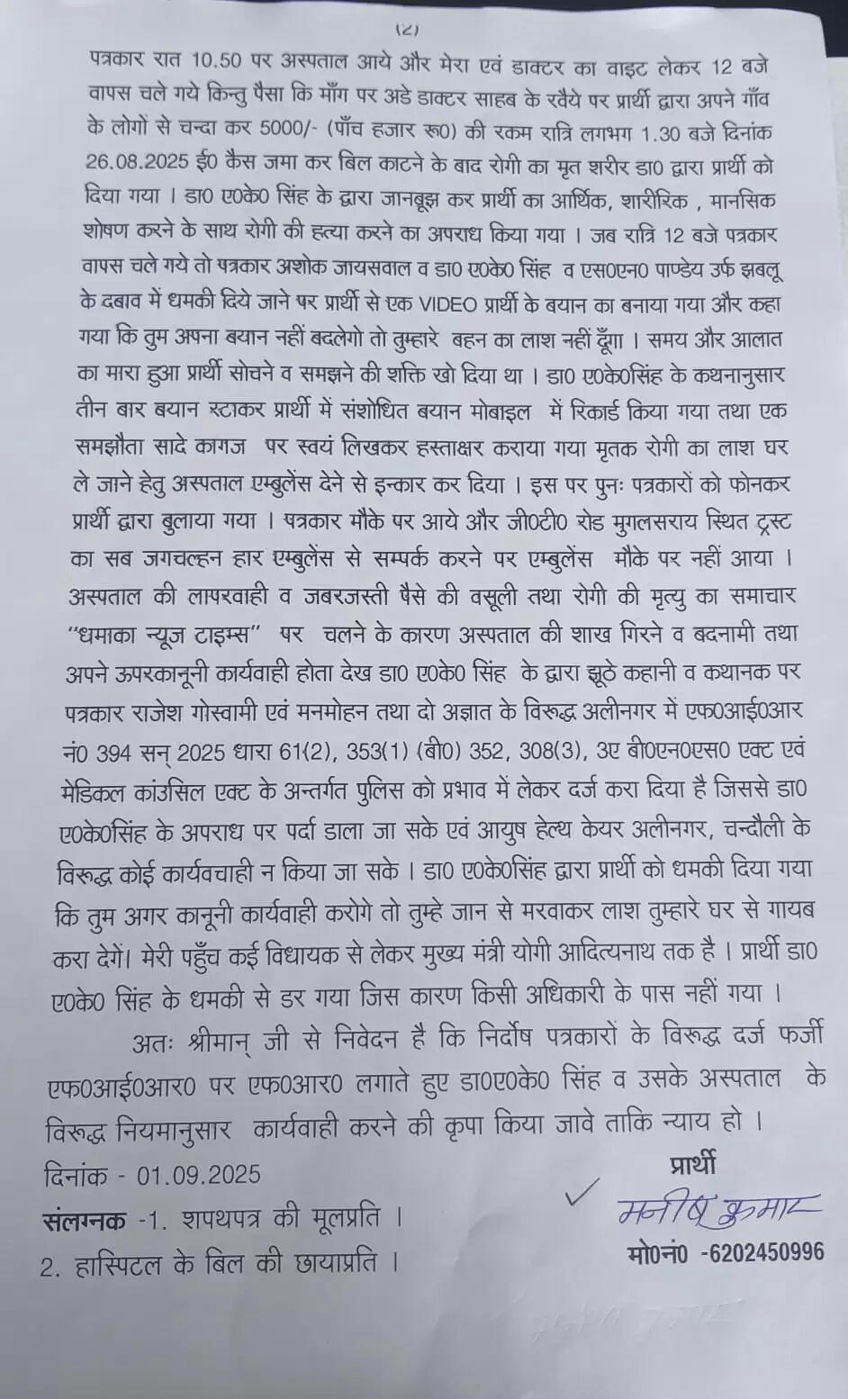 इसी बीच 29 अगस्त को अस्पताल संचालक ने नाराज होकर दो पत्रकारों के खिलाफ अवैध धन वसूली का आरोप लगाते हुए अलीनगर थाने में एफआईआर दर्ज करा दी। आरोप है कि पुलिस ने बिना किसी जांच और साक्ष्य के, केवल दो घंटे के भीतर मुकदमा दर्ज कर लिया।