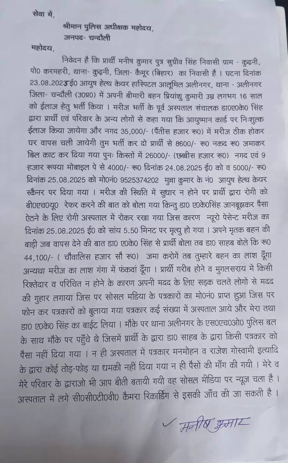 मामले में आज 1 सितम्बर को मृतका के परिजन जिलाधिकारी और पुलिस अधीक्षक चंदौली से मिले। उन्होंने आयुष हेल्थ केयर अलीनगर अस्पताल प्रबंधन और संचालक ऐ के सिंह सहित दो लोगों के खिलाफ लिखित शिकायत दी और निष्पक्ष जांच की मांग की। मृतका के भाई ने मीडिया से कहा कि पत्रकारों ने हमारी समस्या को सामने रखा, तभी शव मिला। उन्होंने पत्रकारों पर दर्ज झूठे मुकदमे को खत्म करने और दोषियों पर कार्रवाई की मांग की।