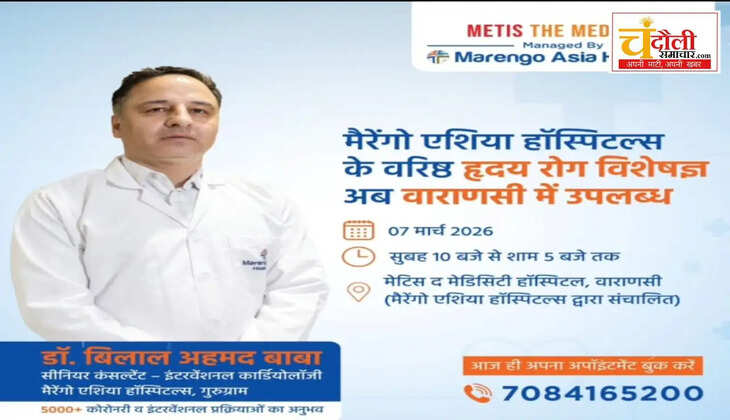 चंदौली जिले के निवासियों और विशेष रूप से हृदय रोग से जूझ रहे मरीजों के लिए एक महत्वपूर्ण और राहत भरी खबर सामने आई है। मैरेन्गो एशिया हॉस्पिटल्स द्वारा संचालित मेटिस द मेडिसिटी हॉस्पिटल, चंदौली में 7 मार्च 2026 को एक विशेष ओपीडी का आयोजन किया जा रहा है। इस शिविर में वरिष्ठ हृदय रोग विशेषज्ञ (इंटरवेंशनल कार्डियोलॉजी के वरिष्ठ कंसल्टेंट) डॉ. बिलाल अहमद बाबा अपनी सेवाएं देंगे। डॉ. बाबा वर्तमान में मैरेन्गो एशिया हॉस्पिटल्स, गुरुग्राम में कार्यरत हैं और उन्हें कार्डियोलॉजी के क्षेत्र में व्यापक अनुभव प्राप्त है।