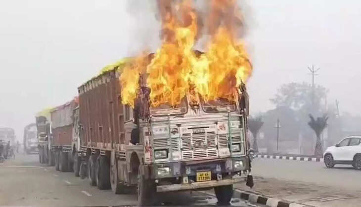 धू-धू कर जला अनाज से भरा ट्रक, दमकल कर्मियों ने कड़ी मशक्कत के बाद आग पर पाया काबू