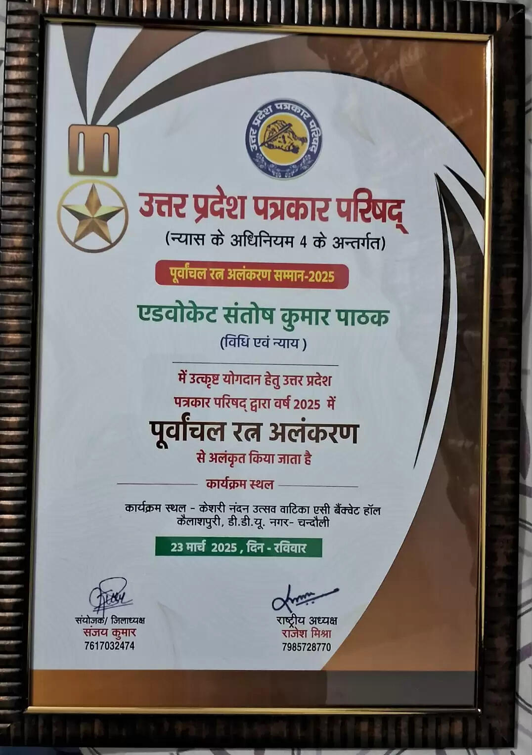 विधि एवं न्याय के क्षेत्र में उत्कृष्ट योगदान के लिए संतोष कुमार पाठक को मिला पूर्वांचल रत्न अलंकरण सम्मान