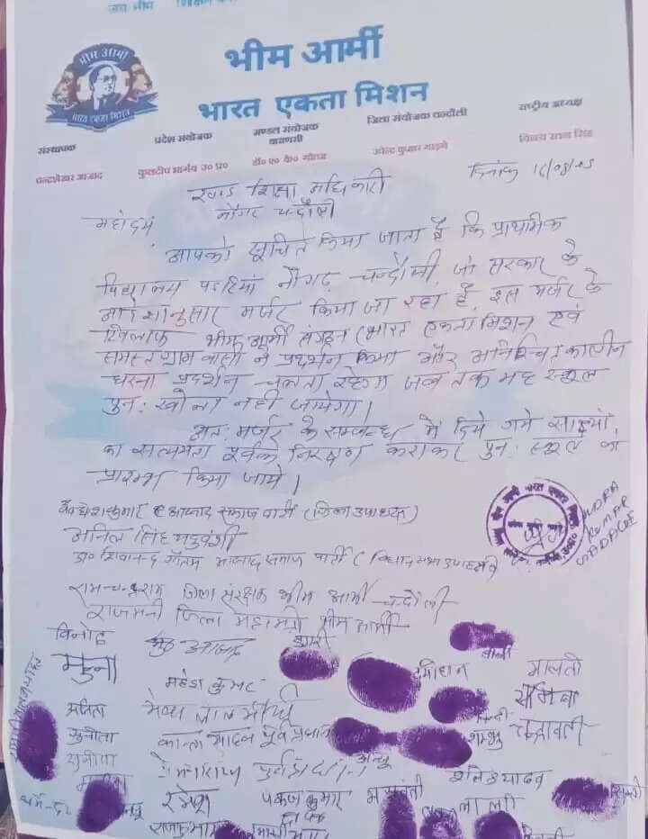 पड़रिया विद्यालय पर धरना दे रहे लोगों के बीच पहुंचे भीम आर्मी के जिलाध्यक्ष उपेंद्र कुमार गाडगे ने साफ कहा – “जब तक मर्ज का आदेश वापस नहीं होगा, तब तक धरना अनवरत जारी रहेगा। यह लड़ाई बच्चों और शिक्षा के भविष्य की है, पीछे हटना अब संभव नहीं।” धरना स्थल पर पूर्व निर्धारित कार्यक्रम के तहत भीम आर्मी संगठन के कार्यकर्ता दोपहर बाद भारी संख्या में पहुंचे। जिला संरक्षक रामचंद्र राम, वरिष्ठ उपाध्यक्ष अवधेश कुमार, पूर्व जिला सचिव श्यामसुंदर के साथ जिला पंचायत सदस्य आजाद अंसारी और मेवालाल मौर्य भी आंदोलन में शामिल हुए। कार्यक्रम संचालन समाजसेवी अनिल यदुवंशी एवं भीम आर्मी के जिला महासचिव राजमणि राज ने किया।