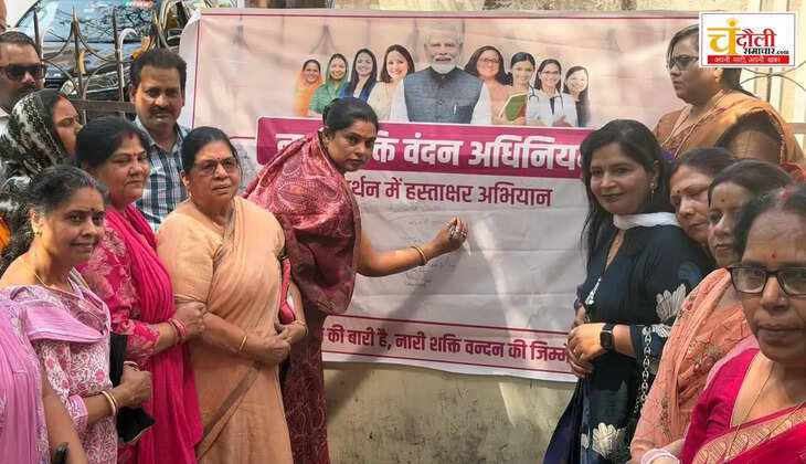 चंदौली के दीनदयाल नगर में 'नारी शक्ति वंदन' हस्ताक्षर अभियान का भव्य आगाज हुआ। राज्यसभा सांसद साधना सिंह ने महिलाओं को विकास की धुरी बताते हुए कहा कि मोदी सरकार की योजनाओं ने आधी आबादी को धुआं-मुक्त रसोई से लेकर सेना में फाइटर जेट उड़ाने तक का साहस दिया है।