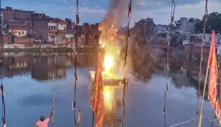 सकलडीहा के प्राचीन शिव सरोवर के बीचोबीच जलाया गया रावण, बना रहा दशहरे मेले का आकर्षण केन्द्र