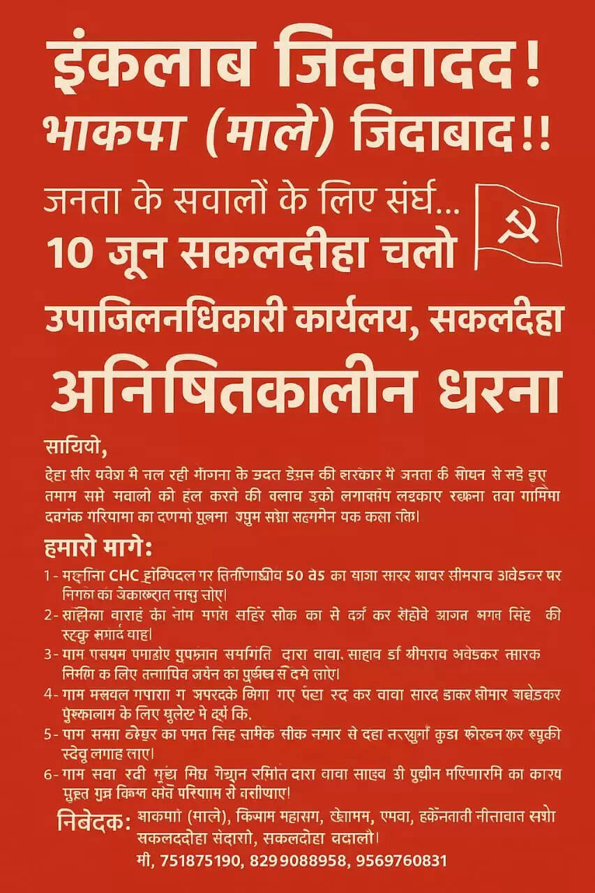 जनता के सवालों को लेकर भाकपा माले का अनिश्चितकालीन धरना, सकलडीहा तहसील पर होगा प्रदर्शन