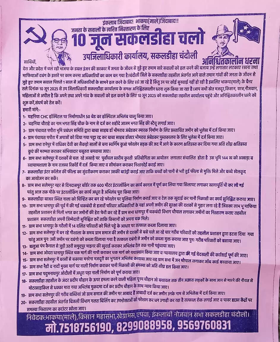 चंदौली जिले के सकलडीहा तहसील अंतर्गत जनसमस्याओं के निराकरण की मांग को लेकर भाकपा माले किसान महासभा, खेग्रामस, एपवा व इंकलाबी नौजवान सभा की अगुवाई में आगामी 10 जून से उपजिलाधिकारी कार्यालय सकलडीहा पर अनिश्चितकालीन धरना शुरू किया जाएगा। पार्टी कार्यकर्ताओं ने ऐलान किया है कि जब तक आम जनता से जुड़े सभी बिंदुओं पर कार्रवाई नहीं होती है तब तक आंदोलन जारी रहेगा।