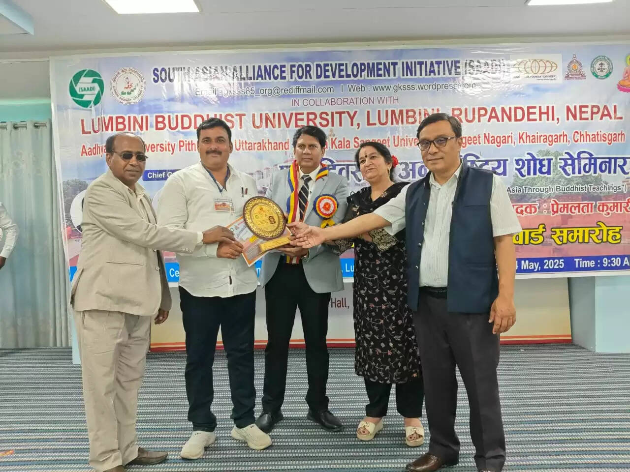 नेपाल में स्थित लुंबिनी बौद्ध विश्वविद्यालय द्वारा आयोजित साउथ एशिया डेवलपमेंट इनिशिएटिवआध्यात्मिक विश्वविद्यालय पिथौरागढ़ 'इंदिरा कला संगीत विश्वविद्यालय खैरा गढ़ छत्तीसगढ़ की ओर से आयोजित कार्यक्रम में शिक्षा शोध साहित्य और समाज सेवा के विभिन्न क्षेत्रों में विशिष्ट योगदान देने वाले प्रतिभागियों को सम्मानित किया गया कार्यक्रम का उद्देश्य दक्षिण एशियाई देशों में शिक्षा संस्कृति महिला सशक्तिकरणऔर शांति स्थापना के प्रयासों को प्रोत्साहित करना था।