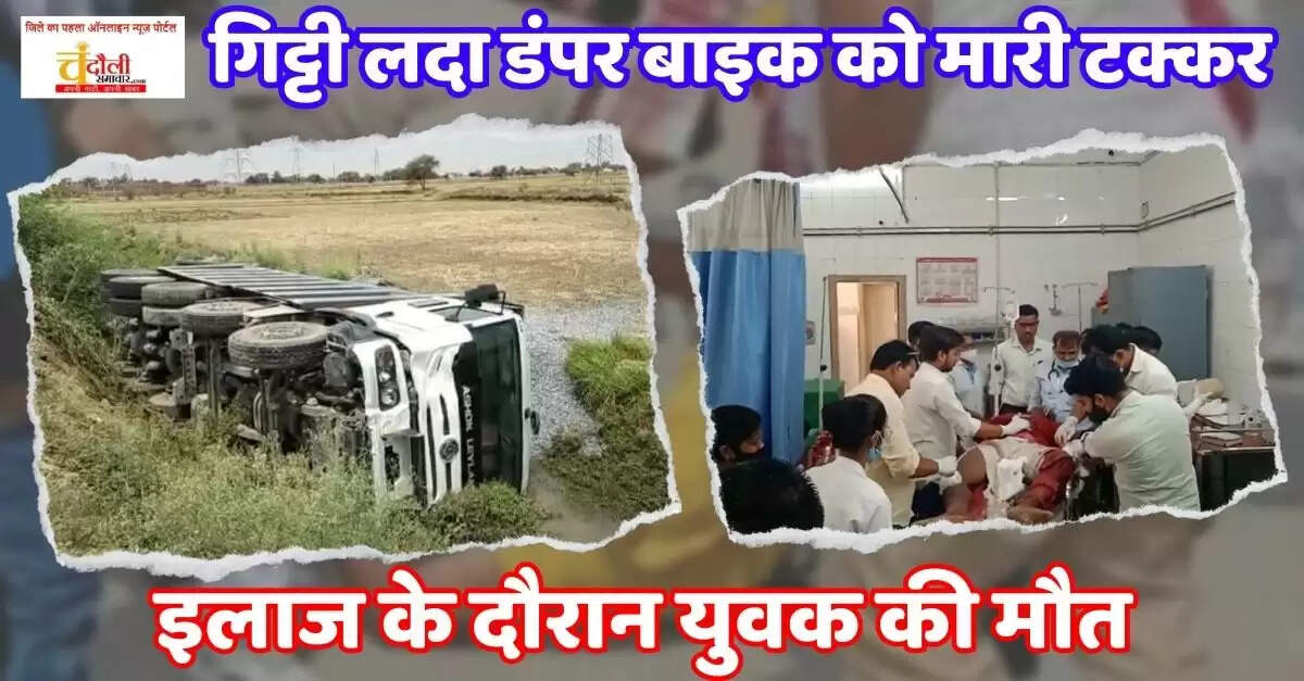 अनियंत्रित डंपर ने बाइक में मारी जोरदार टक्कर, डंपर गड्ढे में पलटा, बाइक सवार की मौत