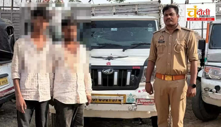 चंदौली में गो-तस्करों के विरुद्ध चलाए जा रहे अभियान के तहत कंदवा पुलिस को आज दोहरी सफलता मिली। थानाध्यक्ष राजीव मल्ल के नेतृत्व में पुलिस टीम ग्राम बहेरा तिराहा के पास चेकिंग कर रही थी, तभी एक संदिग्ध महिंद्रा बोलेरो पिकअप (UP65 QT 5747) आती दिखी। रुकने का इशारा करने पर चालक ने वाहन की गति बढ़ाकर पुलिस टीम पर चढ़ाने का प्रयास किया। पुलिस के घेराबंदी करने पर भागने की कोशिश में पिकअप अनियंत्रित होकर नहर में पलट गई। मौके से पुलिस ने आकाश गौड़ और विशाल कुमार भारती को गिरफ्तार किया। वाहन से 05 गोवंश बरामद हुए।