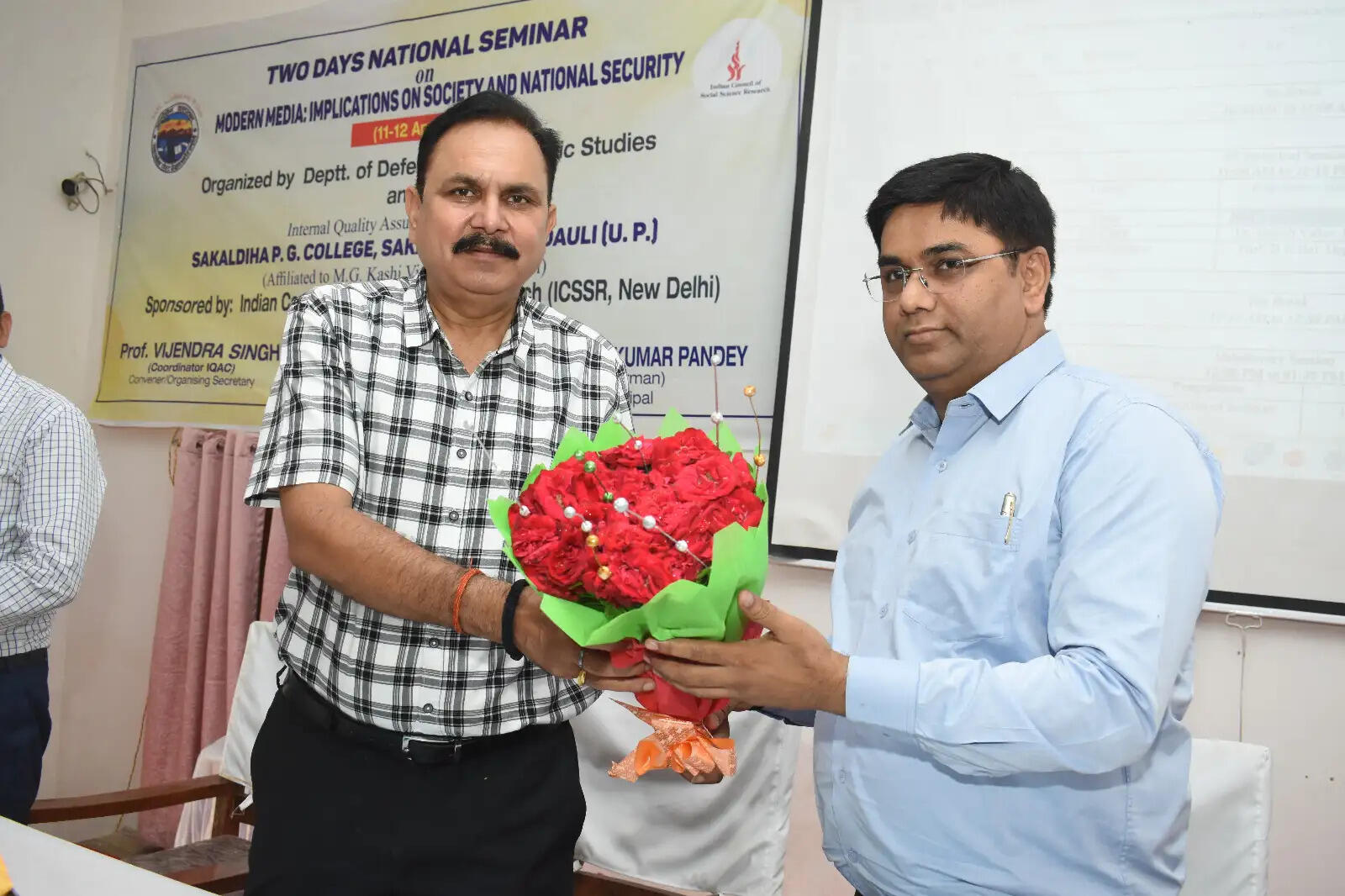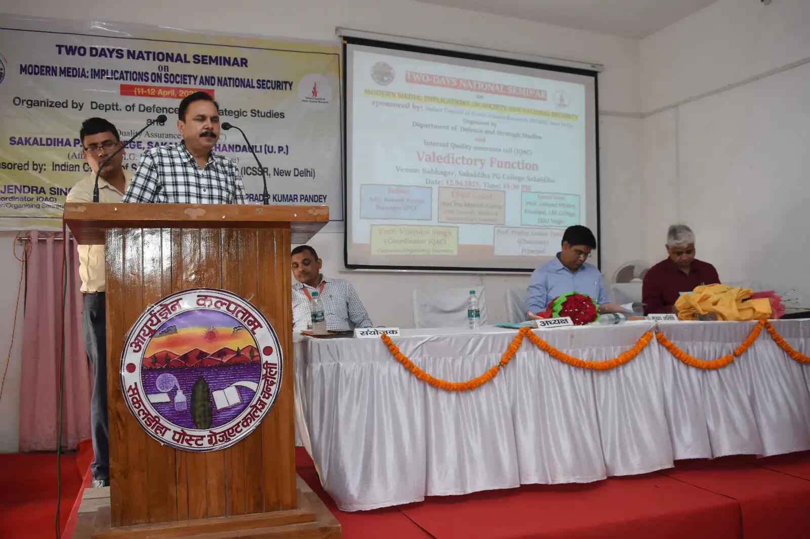 चंदौली जिले के सकलडीहा पीजी कॉलेज में समाज विज्ञान अनुसंधान परिषद नई दिल्ली रक्षा एवं सामरिक अध्ययन विभाग के सहयोग से दो दिवसीय राष्ट्रीय सेमिनार कुशल संपन्न हुआ। राष्ट्रीय संगोष्ठी के संपन्नता सत्र के मुख्य अतिथि मनीष कुमार सीजीएम जिला सेशन कोर्ट वाराणसी तथा विशिष्ट अतिथि प्रोफेसर उदयन मिश्रा प्राचार्य लाल बहादुर शास्त्री पीजी कॉलेज दीनदयाल नगर एवं अध्यक्षता महाविद्यालय के प्राचार्य प्रोफेसर प्रदीप कुमार पांडेय ने की।