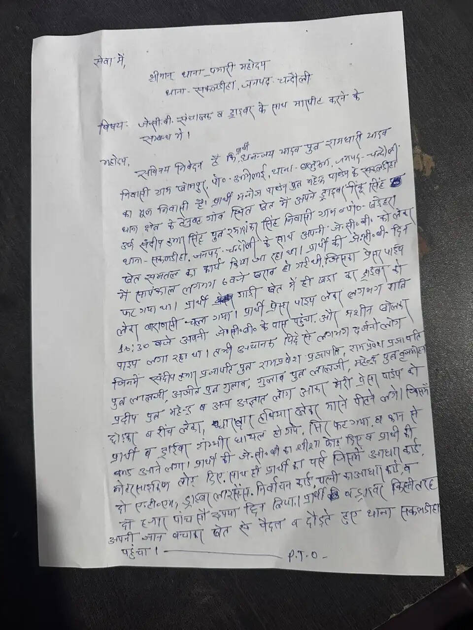 उग्र भीड़ को देखते ही जेसीबी चालक रिंकू सिंह और धनंजय यादव वहां से भाग खड़े हुए इसके बाद सकलडीहा कोतवाली पहुंचकर दोनों पीड़ितों ने अपनी तहरीर दी है। इस तहरीर में बताया गया है कि गांव के दर्जनों लोग ने उनके ऊपर हमला बोला है और उनके साथ मारपीट की तथा उनके पर्स तथा अन्य सामान भी छीन लिए हैं।